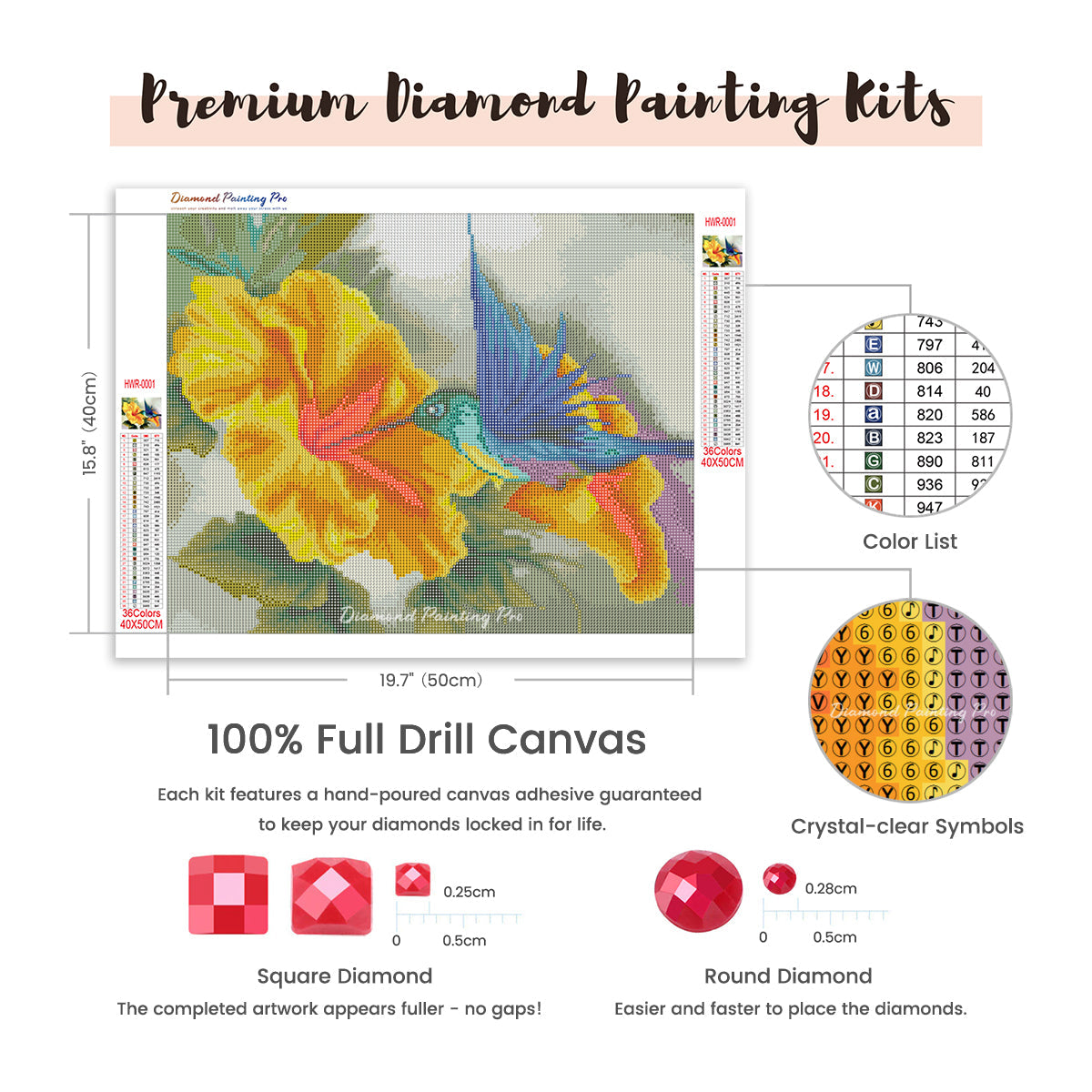 Full Drill Canvas (15.8"x19.7" / 40x50cm): Immerse yourself in the full diamond painting experience with the perfect canvas size for detailed masterpieces. Crafted with care using premium HD quality tarpaulin canvas, it's durable, waterproof, moisture-proof, and wrinkle-free, ensuring a stress-free painting process. Crystal-clear symbols provide easy guidance, while poured-glue canvas adhesive secures your diamonds, maintaining pattern visibility with the transparent cover.
